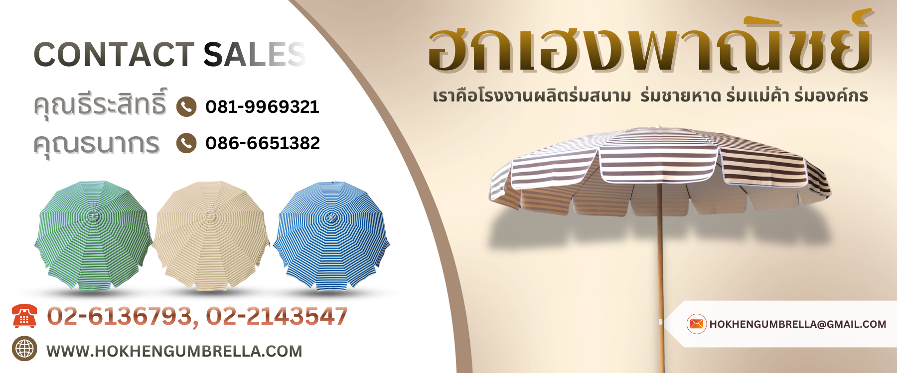 ฮกเฮงพาณิชย์ : เราคือโรงงานผลิตร่มครบวงจร อาทิ ร่มชายหาด ร่มสนาม ร่มแม่ค้า ร่มองค์กรสั่งทำ ดีไซน์ตามแบรนด์ งานสวยคุณภาพดี